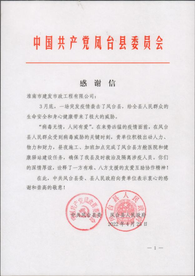 4月25日,公司收到一封特殊的感謝信,信的落款是中共鳳臺縣委、鳳臺縣人民政府。信中寫道:“貴單位積極出動人力、物力和財力,晝夜施工,加班加點完成了鳳臺縣方艙醫(yī)院和健康驛站建設(shè)任務(wù),確保了我縣及時救治及隔離涉疫人員?!?/p>