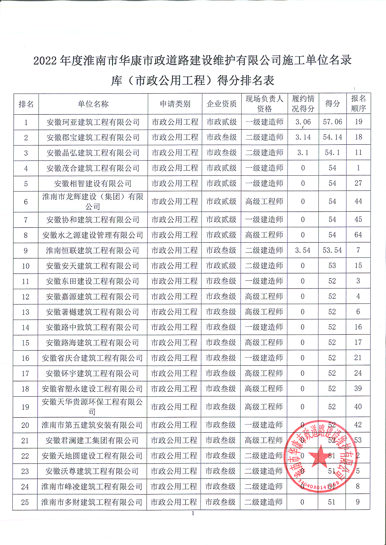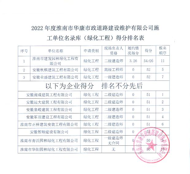 根據(jù)《2022年度淮南市華康市政道路建設(shè)維護(hù)有限公司工程建設(shè)項(xiàng)目施工勞務(wù)單位名錄庫征集公告》相關(guān)規(guī)定,目前已按公告規(guī)定的評(píng)審方法完成評(píng)審工作?,F(xiàn)將評(píng)審結(jié)果公示如下:見附表
